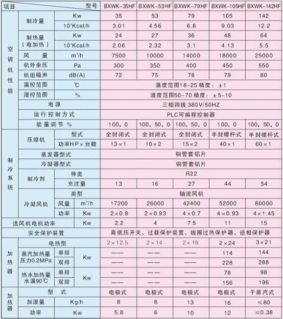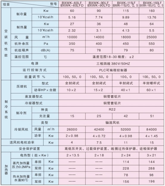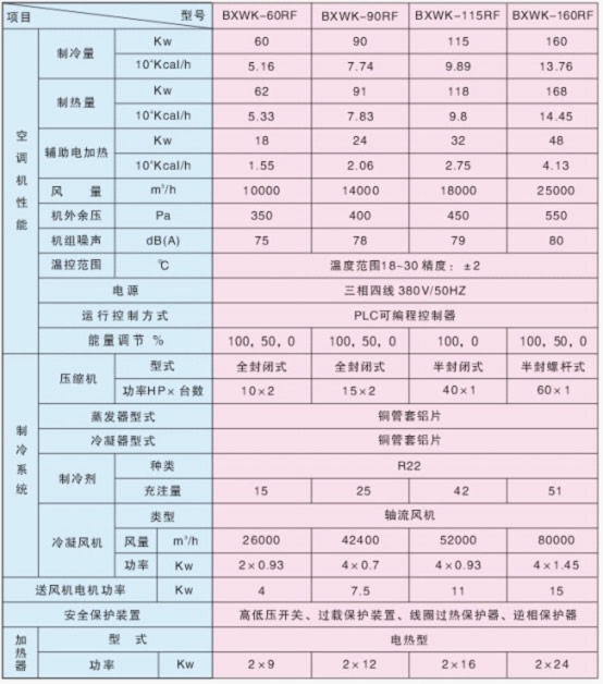 1、表中制冷量标定工况:进风干球温度27℃,湿球温度19℃;冷凝器进风干球温度35℃,湿球温度24℃。