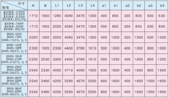 6.型号命名方法:例如BXWK-60LFD,其中:BXWK-屋顶空调,60-制冷量,L-冷风型(R为热泵型,H为恒温恒湿型),F-风冷,D-电加热(Q为蒸汽加热,S为热水加热)。