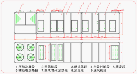 如条件允许,在压缩冷凝段与处理送风段之间拉开600mm左右,则更有利于制冷管道施工。